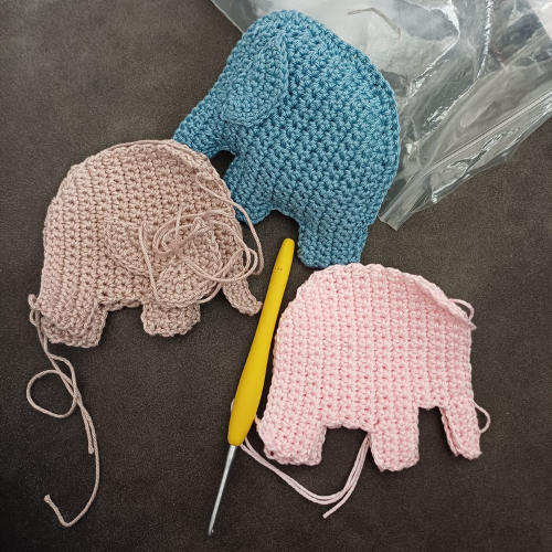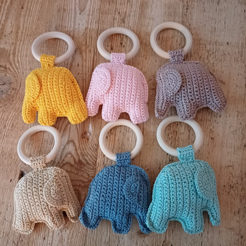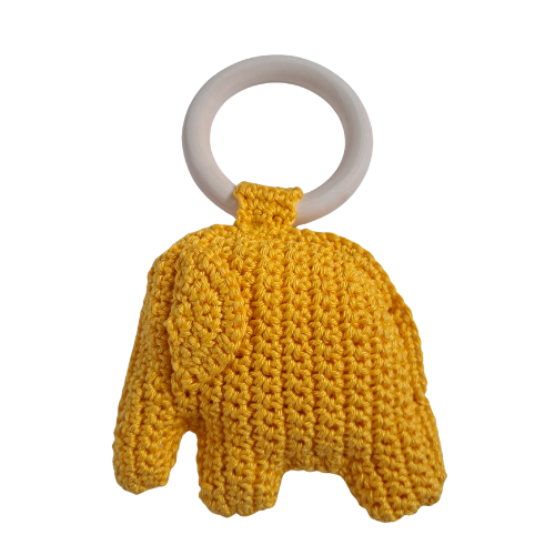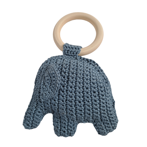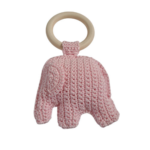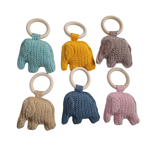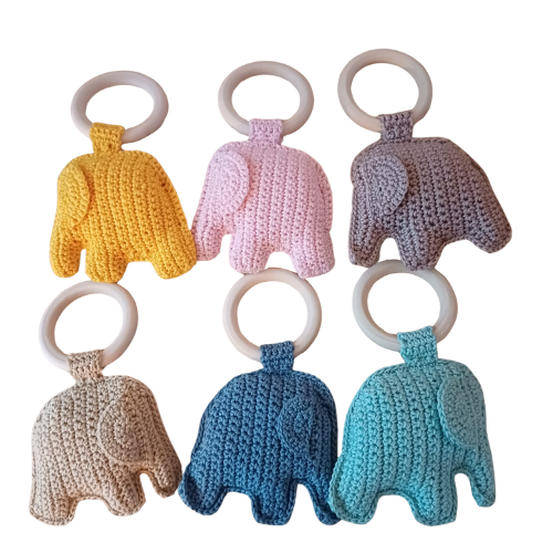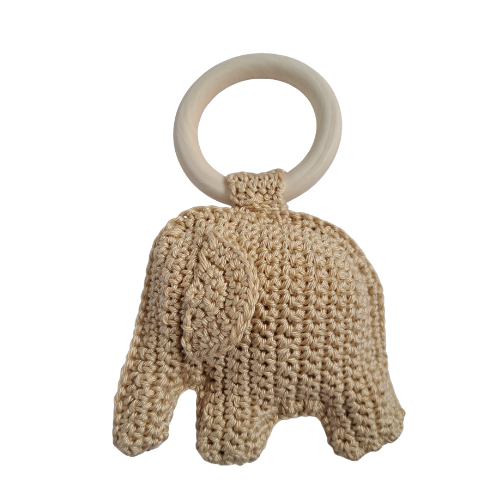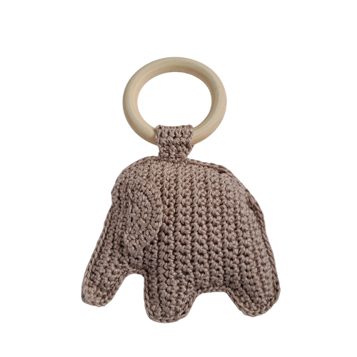 Dit gehaakte olifantje is met de hand gemaakt van zacht katoen en heeft een gladde houten ring waar baby’s veilig op kunnen bijten. Binnenin zit een subtiel rammelschijfje dat zacht klinkt bij elke beweging – net genoeg om nieuwsgierigheid te prikkelen, zonder te hard te zijn.