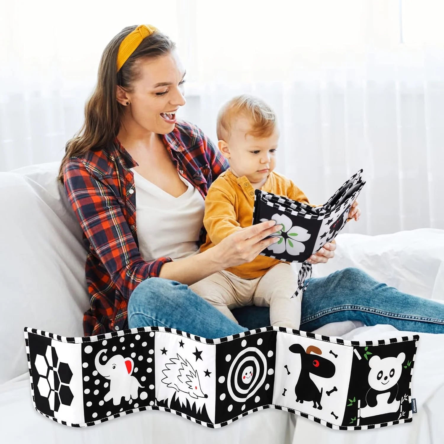 In de eerste maanden zien baby’s vooral sterke contrasten. Dit zachte stoffen boekje met zwart-wit patronen en eenvoudige illustraties helpt hun ogen te trainen en maakt de wereld spelenderwijs interessant.